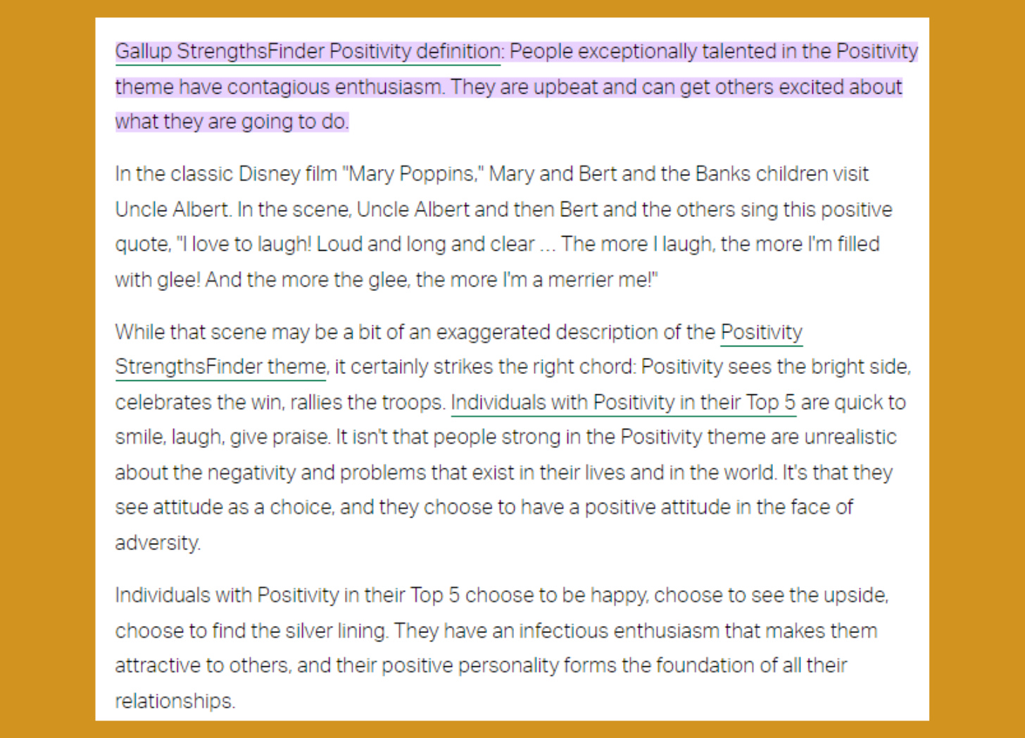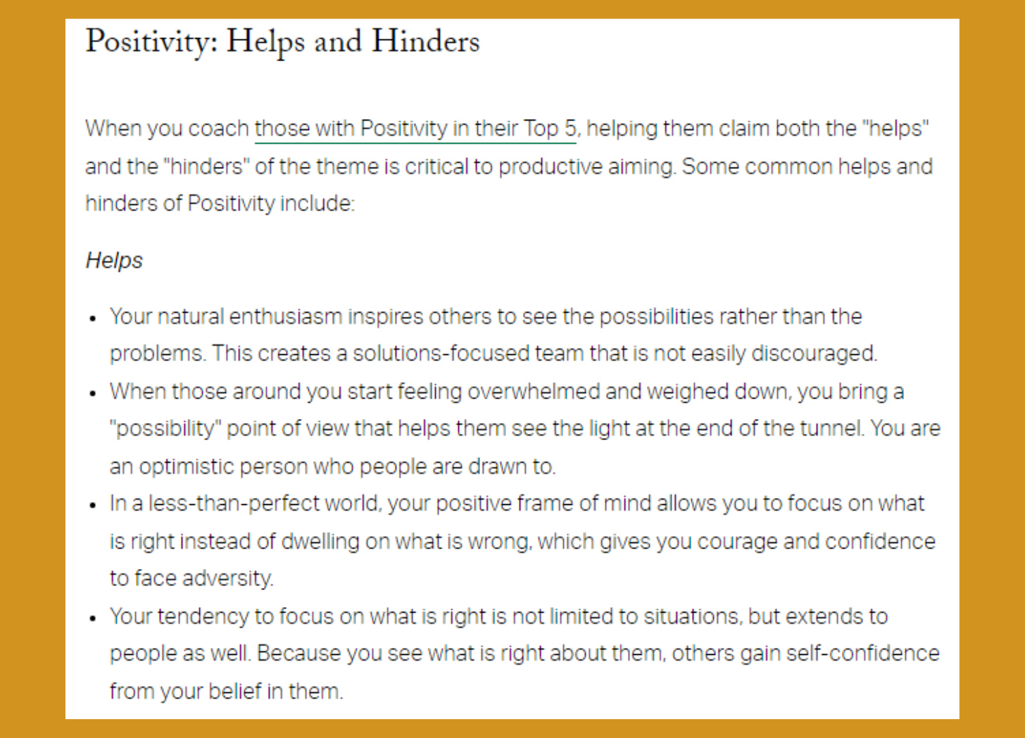 Gallup/CliftonStrengths assessement goes on to suggest that positivity can be “helpful” in these circumstances.