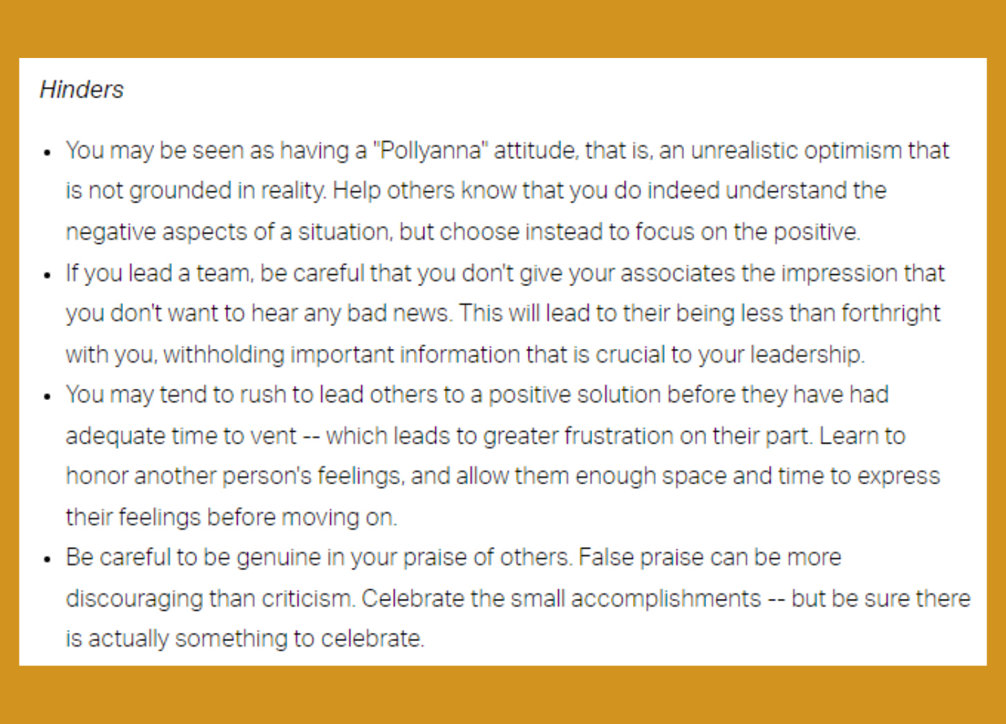 On the flip side, here is how Gallup/CliftonStrengths talent assessment describes “positivity” serving as a hindrance.